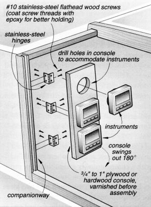 Instead of mounting your electronics in the bulkhead, try mounting them on a hinged panel that mounts along side of your companionway to swing both into view and out of the way in the security of the cabin when not in use.